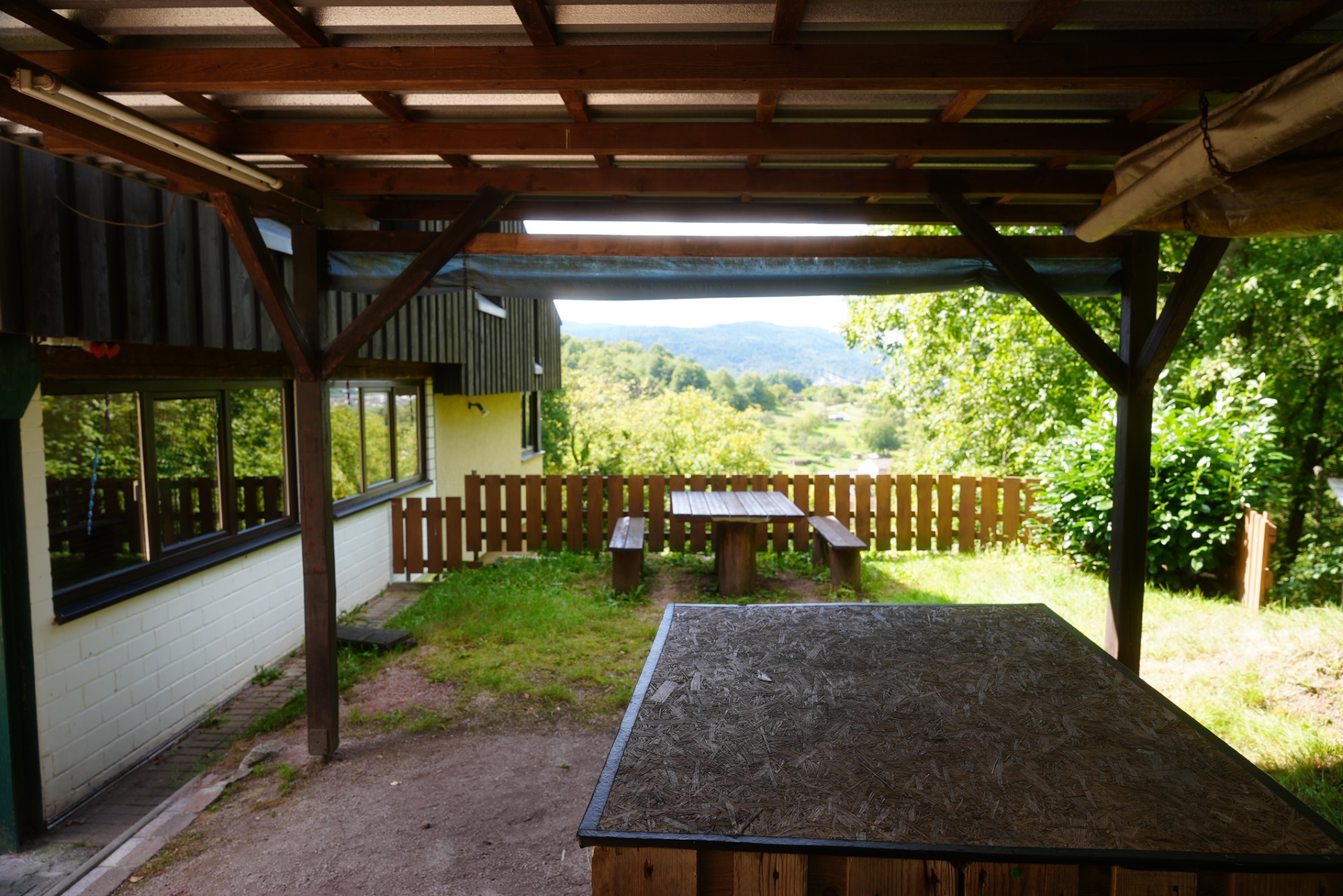 - überdachte Terrasse, rechts Terrassenbereich ohne Überdachung